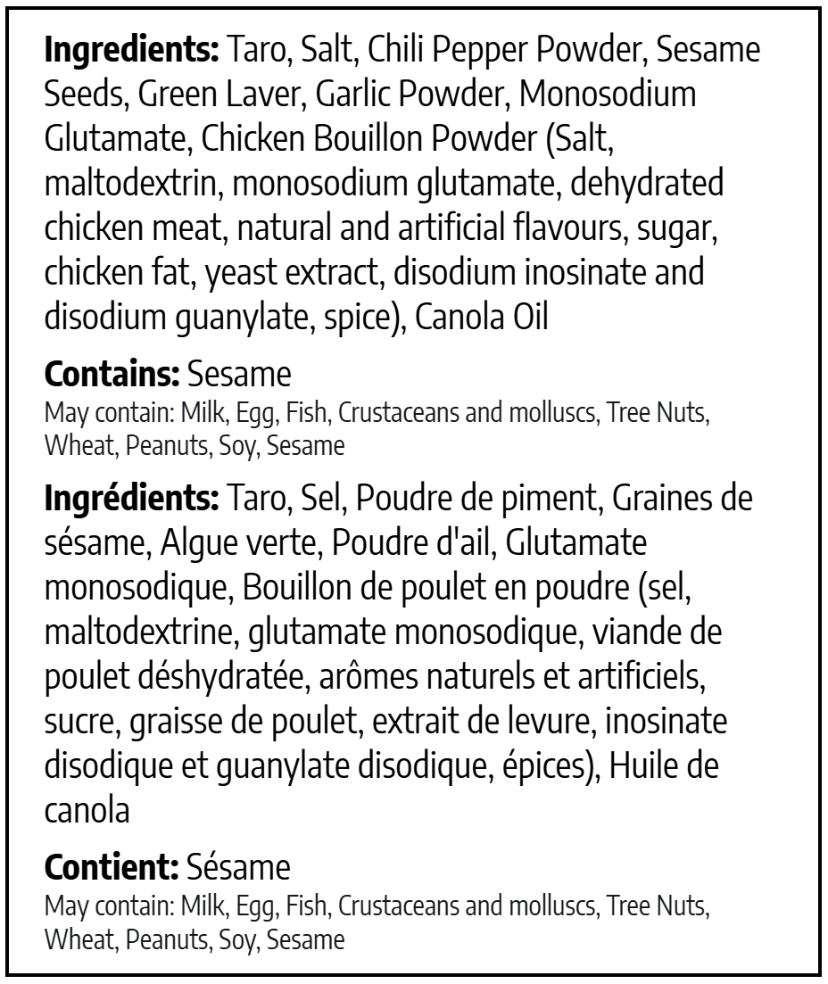 Our Taro Chips are fried fresh every week and best enjoyed within 4–5 weeks of production.